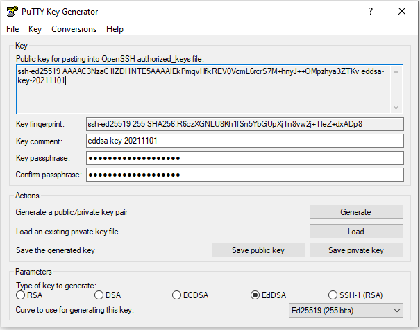 Możesz podać hasło dla klucza, wpisując je w pole „Key passphrase” i „Confirm passphrase”.